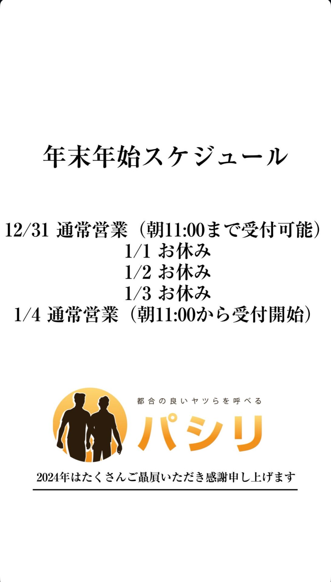 休業期間:2025年1月1日(水)~1月3日(金) 最終営業日:2024年12月31日(火)~10時迄
